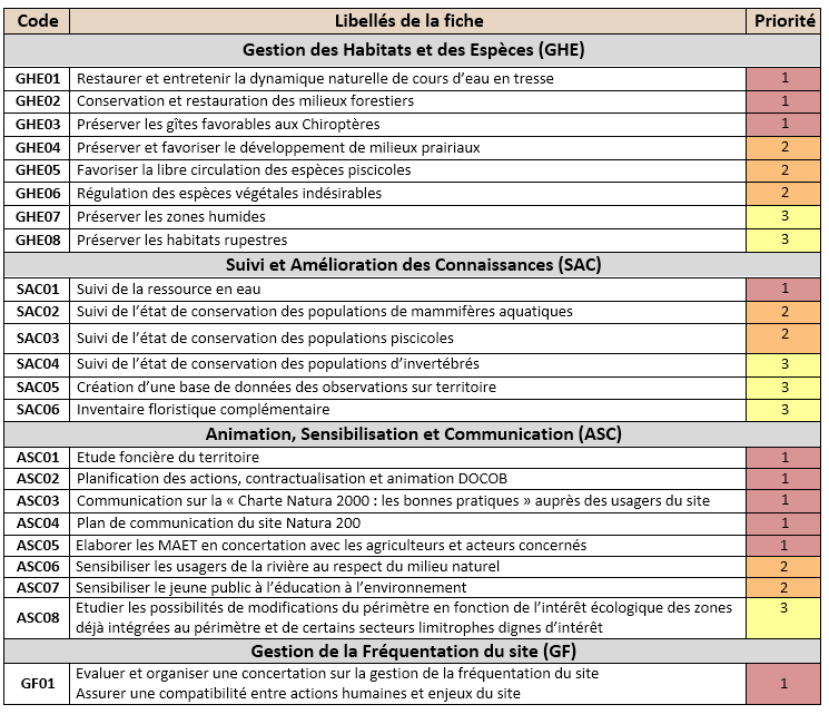 Les actions de gestion Vous trouverez ci-dessous le tableau récapitulatif des actions de gestion préconisées par le Document d'Objectifs :